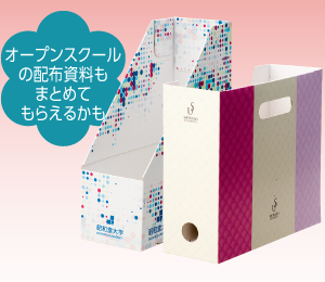 以前は資料だけを配布していたのですが、今回「はいるケース」も一緒にお渡ししたところ、来校された皆様も資料をまとめる事ができて持ちやすいと好評でした。